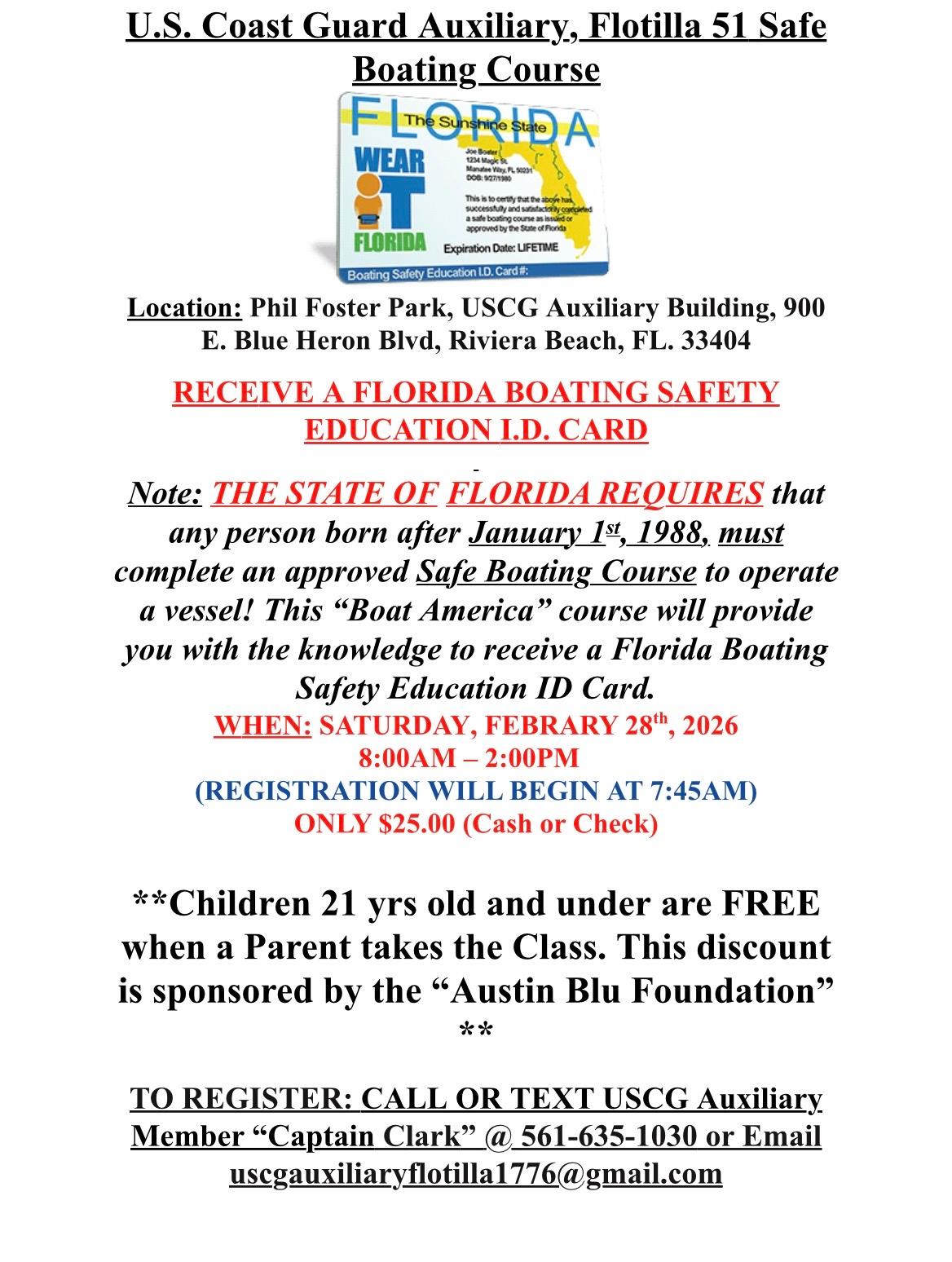 The course, which is approved by the Florida Fish and Wildlife Conservation Commission and meets state boating safety education requirements, can be taken at the student’s own pace. After passing the exam, they can print their own certificate of completion for immediate use and will receive a lifetime card from the Florida Fish and Wildlife Conservation Commission.